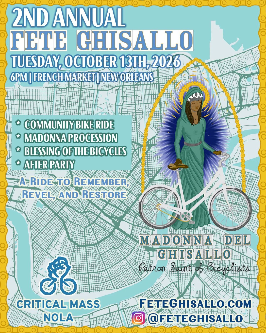 On Tuesday, October 13th, 2026, join us for the second annual Fête Ghisallo—a ride of remembrance, advocacy, and celebration in honor of the Patroness of Bicyclists and in memory of the bicyclists we’ve lost on the streets of New Orleans.