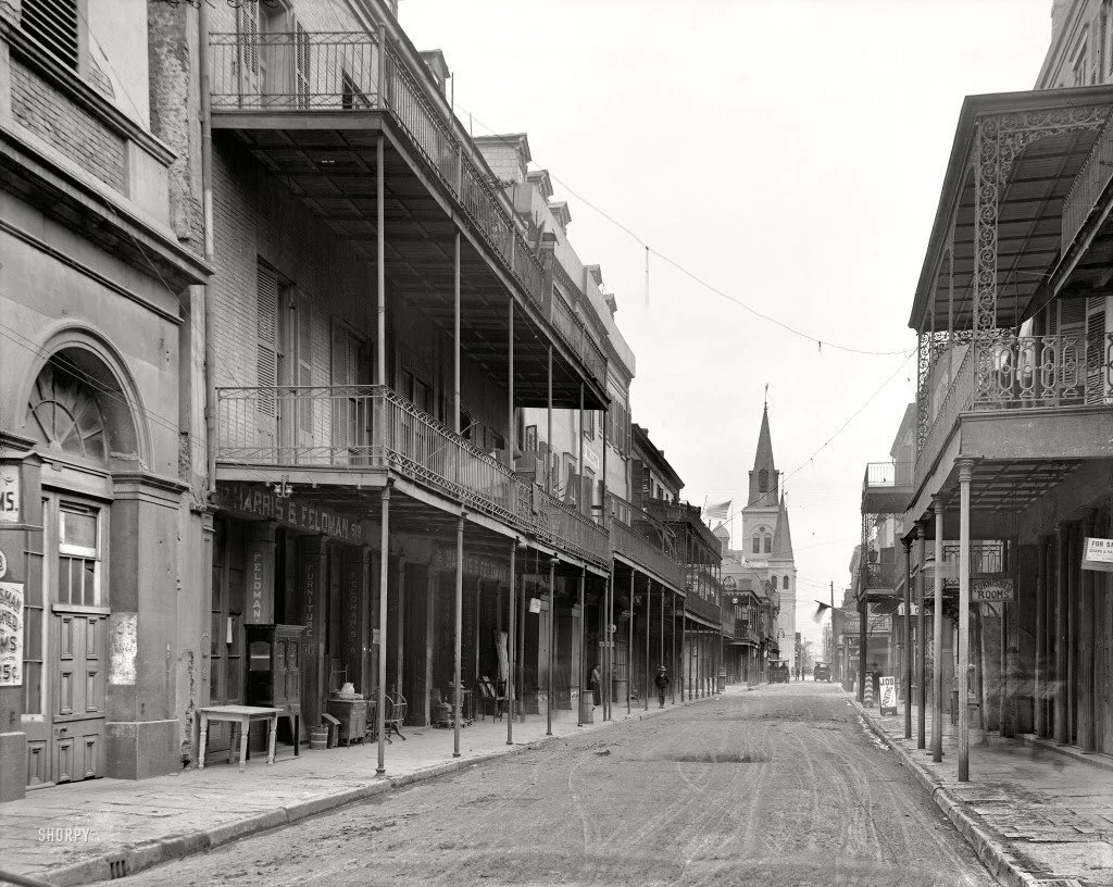 * The images above are a then and now comparison of the 500 block of Rue Chartres before the parking garages were erected.