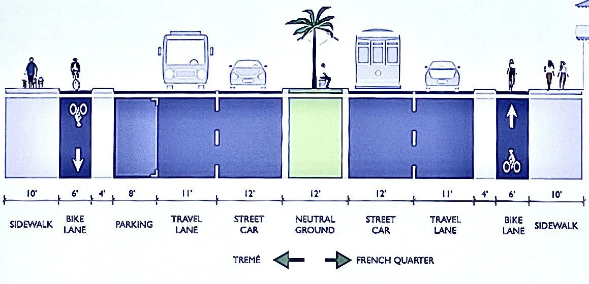 North Rampart Traffic Calming: North Rampart is the Autobahn of the French Quarter. Speeding is beyond excessive and it goes unchecked. North Rampart can be reduced to one motor vehicle lane (riverbound) alongside the streetcar tracks. This modification will mitigate speeding and enhance pedestrian and cyclist safety. A separated bicycle lane can be added to encourage bicycling to and in the historic district.