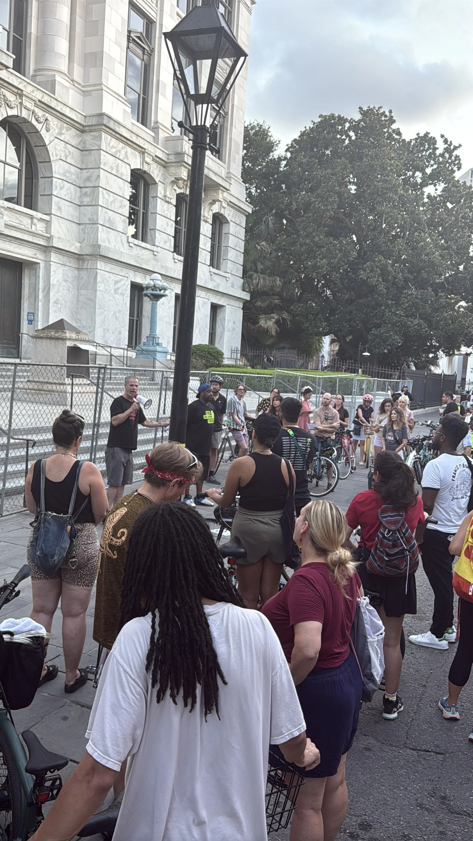 On a humid New Orleans evening, dozens of riders gathered with Critical Mass Nola, rolling out from the steps of the Hale Boggs Federal Building—the site of the “No National Guard in New Orleans” rally. With music spilling from bike speakers, the ride cut through the streets of the city, moving as one living procession of resistance. From the federal building, the group wound its way across the French Quarter to the marble steps of the Louisiana Supreme Court.