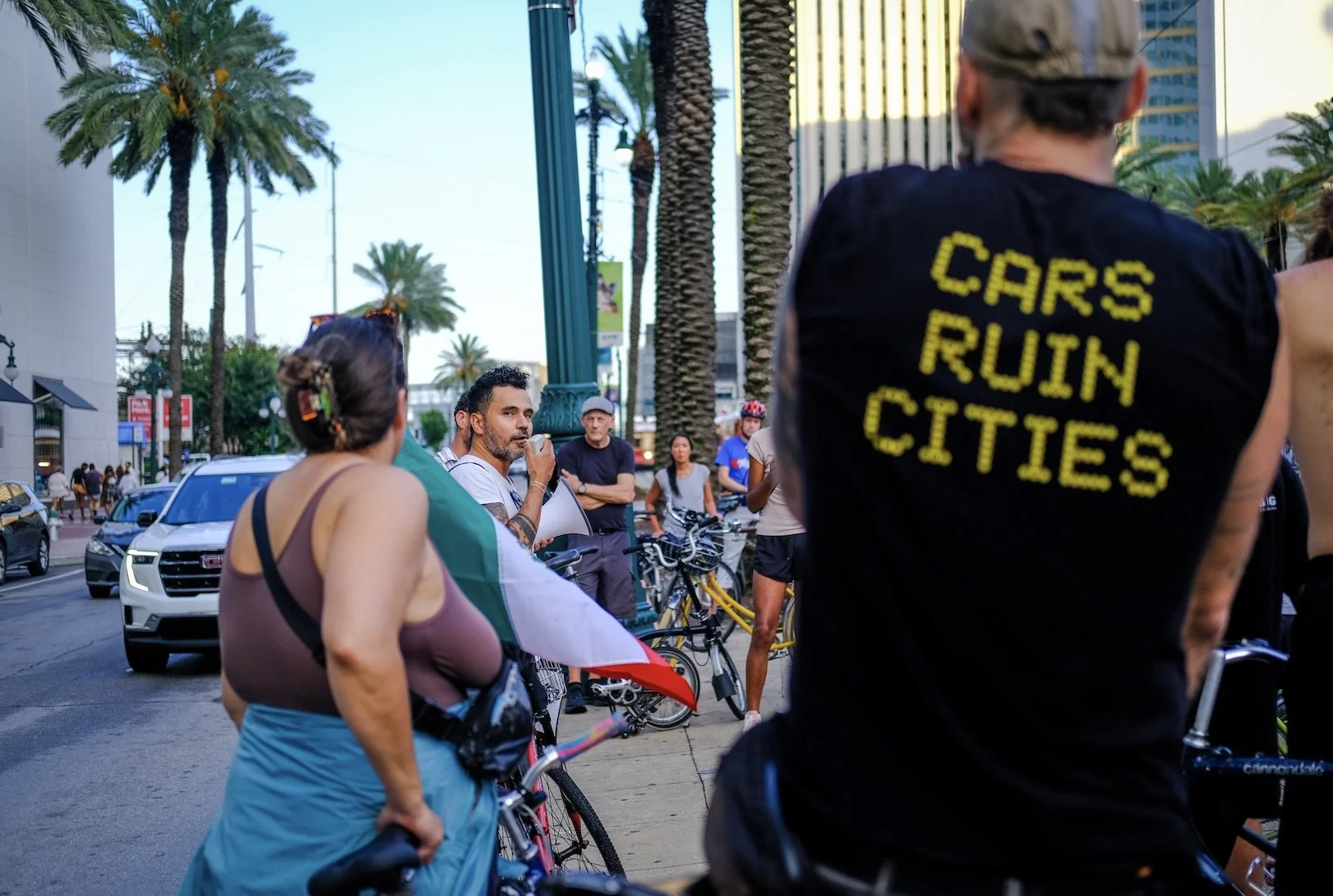 At the start of our ride, Nola to Angola elaborated on the bicycle ride they organize to Angola Prison every October. They raise funds that provide free monthly transportation for families to visit their incarcerated loved ones. This work not only breaks down the isolation imposed by the prison system, but also affirms the right of families to stay connected in the face of policies designed to sever those bonds. Their ride is both a fundraiser and an act of solidarity, linking the struggle for mobility in our city with the struggle against mass incarceration in Louisiana.