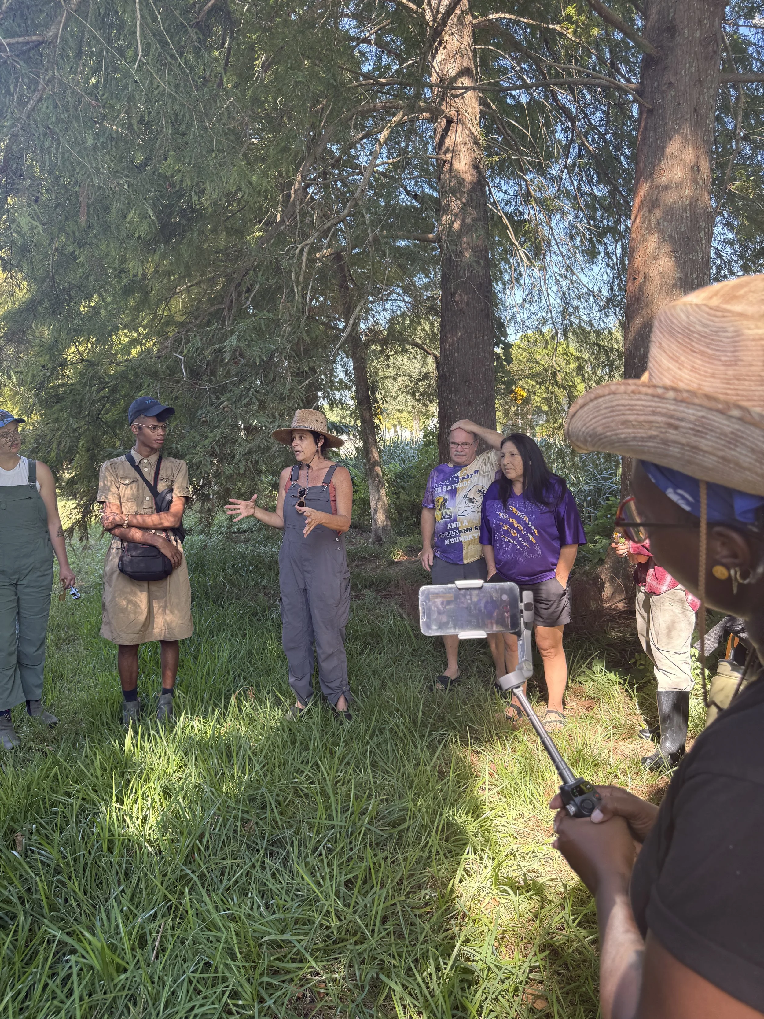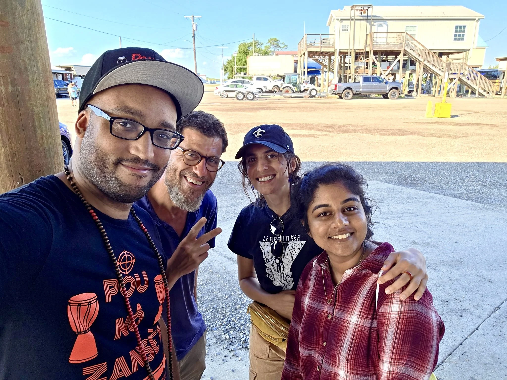 Monique welcomed us to her property, where she is cultivating native plants, trees, and medicinal herbs. She also shared the struggles of the Native peoples of southern Louisiana—from Pointe-au-Chien, Houma, New Orleans, to St. Bernard Parish. Verdin is a transdisciplinary storyteller, artist, wild gardener, and citizen of the Houma Nation. She serves as the director of the Land Memory Bank & Seed Exchange, a project rooted in community-driven memory, ecological restoration, and Indigenous cultivation of place. She collaborates with Bvlbancha Liberation Radio and supports the Okla Hina Ikhish Holo network—Indigenous gardeners working across the Gulf South. Her work bridges environment, culture, lineage, and climate: she has documented how domestic landscapes, wetlands, coastlines, and communities in southeast Louisiana are entangled in colonial and extractive histories. Extended the upmost hospitality, her family treated us to a magnificent Southern Louisiana meal that was highlighted by freshly caught boiled shrimp.