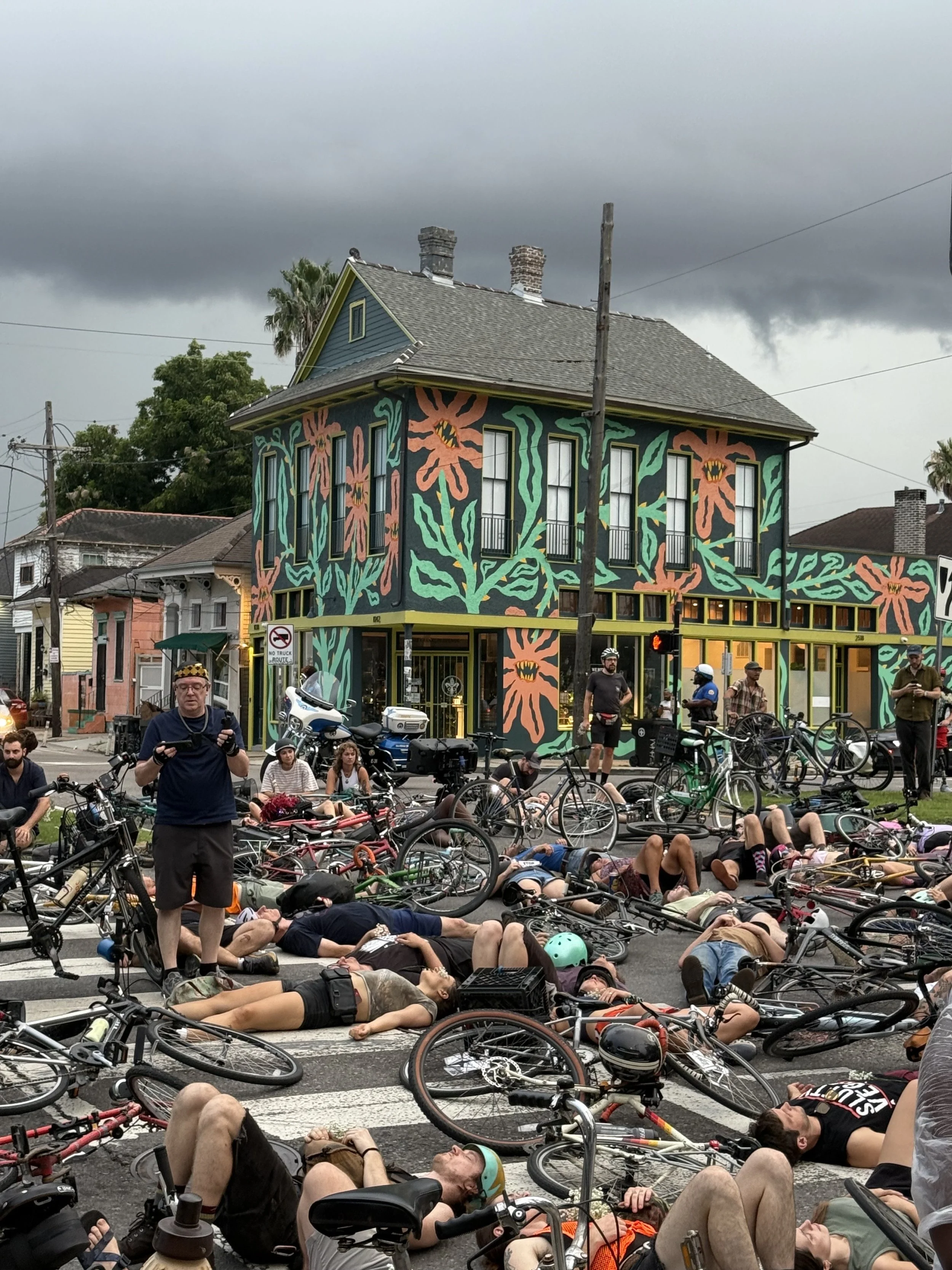 When we lie down together in New Orleans, we echo that history. A die-in is not only a warning—it is an act of solidarity. Cyclists, pedestrians, and allies gather and surrender their individual motion in order to embody a shared stillness. Strangers lie shoulder to shoulder. People of different backgrounds, ages, and neighborhoods become one collective body, each person representing not only themselves but everyone lost to traffic violence. That moment of togetherness is a statement that your grief is my grief, your fight is my fight.