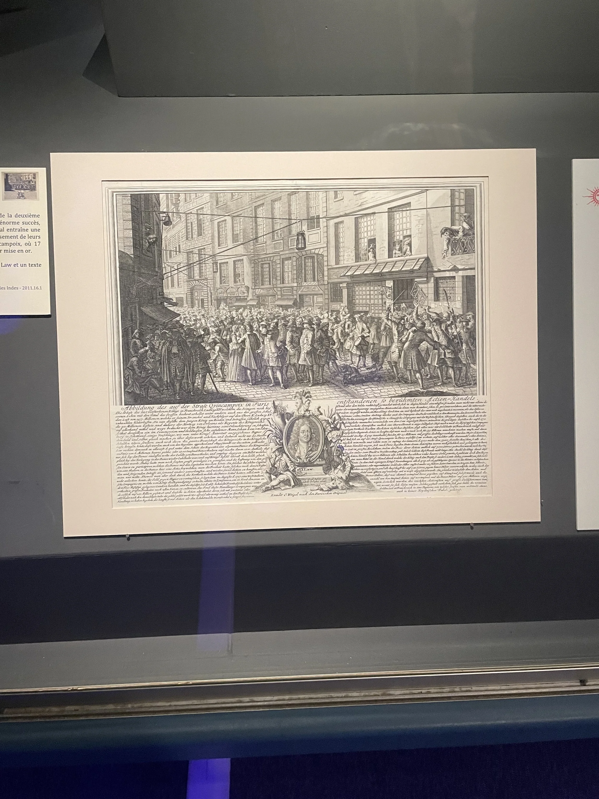 An illustration on display at the museum, depicting people buying shares in John Law’s Mississippi Company on Rue Quincampoix (Paris, France).